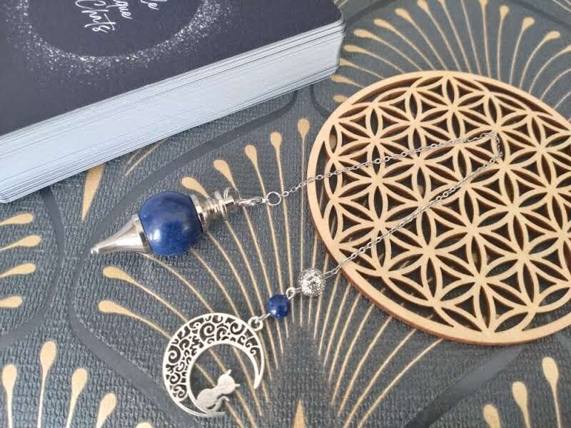 Le pendule divinatoire boule (aussi appelé séphoroton) est une création unique signée Bulles de Douceur. Composé d’une sphère en pierre naturelle lapis-lazuli, d'une breloque magique et d'une perle en pierre assortie.